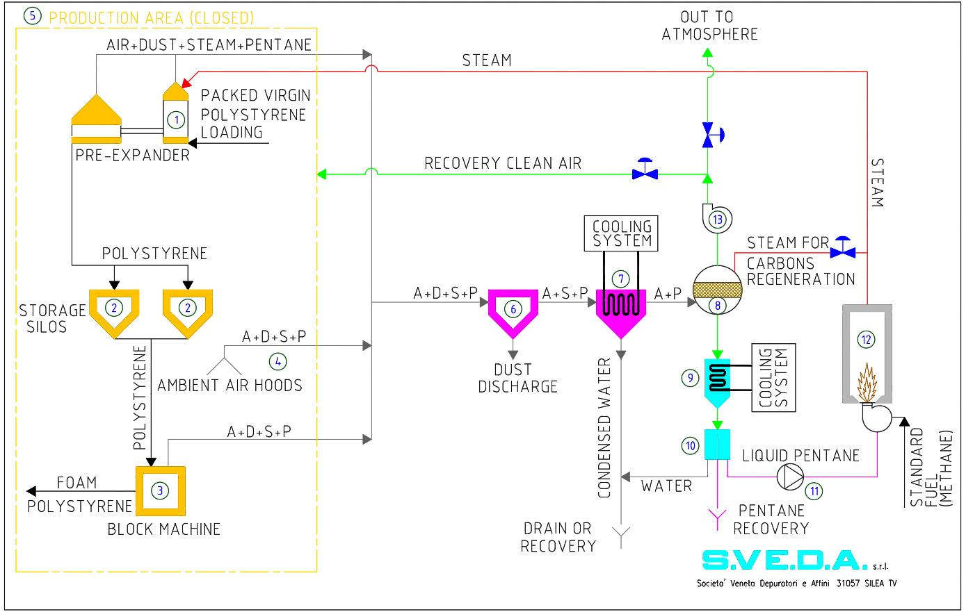 Polluted air is contaminated with pentane, dust and water vapor [4]. After extracted dust with a special filter [6], and condensed the vapor with a cooling unit, the air is sent to one or more adsorbers with ACTIVATED CARBON where pentane is retained [8]. Pentane is recovered through a water vapor stream and reduced into liquid phase via condensation [9]. Recovered pentane is stored in a tank and sent to the boiler [12], which produces steam for the polystyrene production machines. The boiler, designed by us, works with pentane, methane or a mixture of the two.